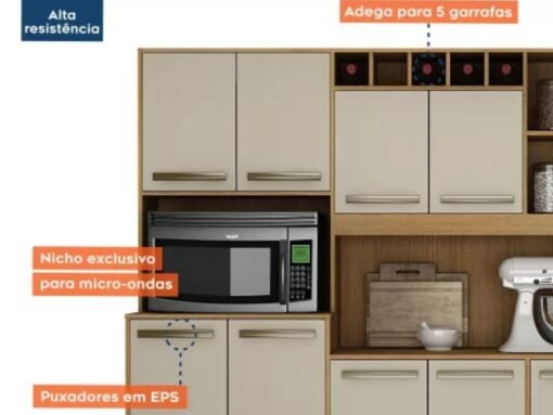 O Armário Kit de cozinha Petra é super vesátil e completo. Composto por 11 portas e 2 gavetas, com puxadores em EPS cromado, pés reguláveis e corrediças telescópicas, ele é a opção ideal pra você que quer renovar a sua cozinha.