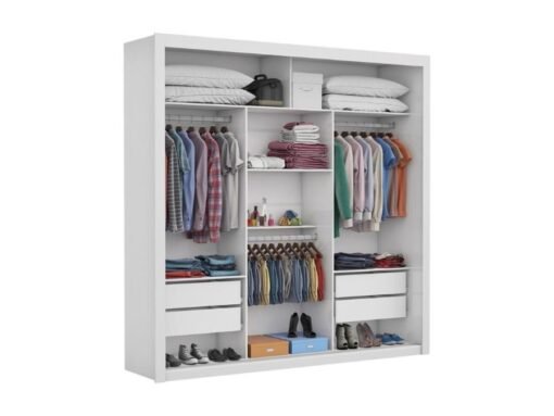 O Guarda Roupa Veneza Plus com 3 portas de correr, 2.08m de altura, 1.85m de largura e 0.46cm de profundidade, combinado com 4 gavetas, 4 prateleiras e 3 cabideiros, deixa o produto com uma divisão funcional capaz de proporcionar ao cliente acomodar todas as suas roupas de maneira mais organizada e com mais visibilidade.