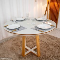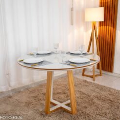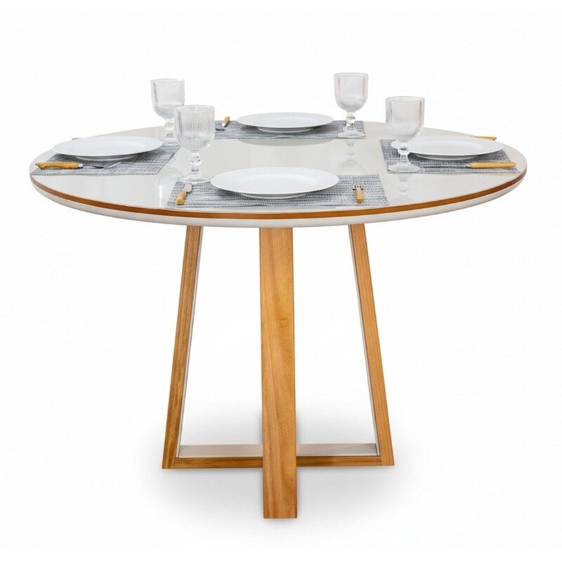 3{%%}Descrição{%%}Mesa de Jantar Atlanta Redonda 120cm Cinamomo/Vidro Off – Minas Plac