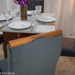 3{%%}Descrição#Como montar{%%}Mesa de Jantar Helo 90×90 Tampo MDF Vidro Off 4 Cad. Lisboa Veludo Cinza 507 Madeira Maciça