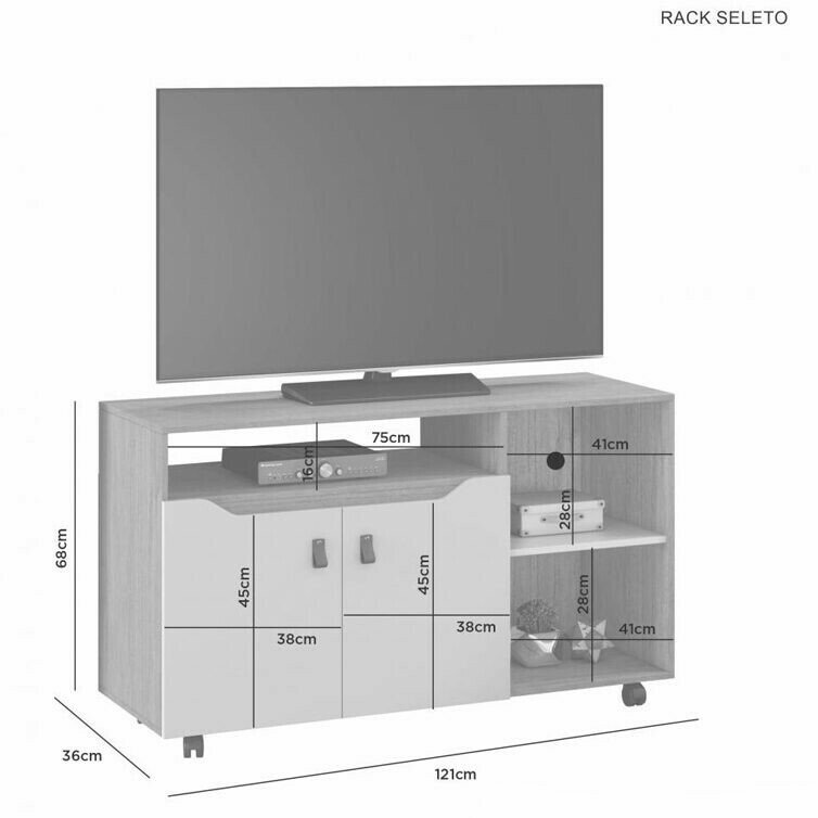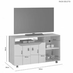 3{%%}Descrição#Vídeo{%%}Rack Seleto Larg. 1.21m Cinamomo/Off para TV até 49″ – JCM