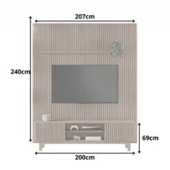 3{%%}Descrição{%%}Rack Triunfo Larg. 2.00m Cinamomo/Off + Painel Riso Larg. 2.07m Cinamomo Ripado para TV até 75″ – JCM