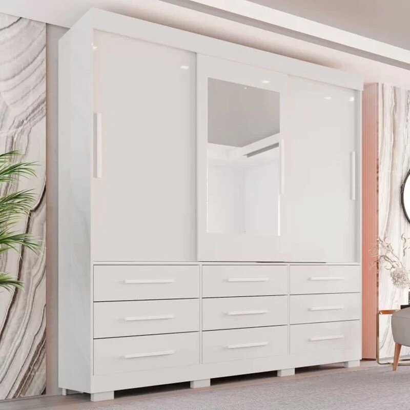 3{%%}Descrição{%%}Roupeiro Athenas C/Espelho 3 Pts. 9 Gav. Branco Larg. 1.80m C/Pés Bianchi + Cama Box Casal Ortopédico D33 Rondoconfort Rondomóveis