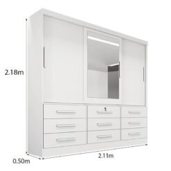 3{%%}Descrição{%%}Roupeiro Casal Turim Branco 3 Portas 9 Gavetas C/ 1 Espelho 100% MDF Larg. 2.11 – Bianchi