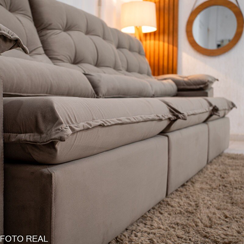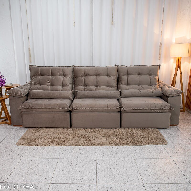 3{%%}Descrição{%%}Sofá Retrátil Reclinável Emanuelly 3.20m Veludo Capuccino 02 – D28 Soft