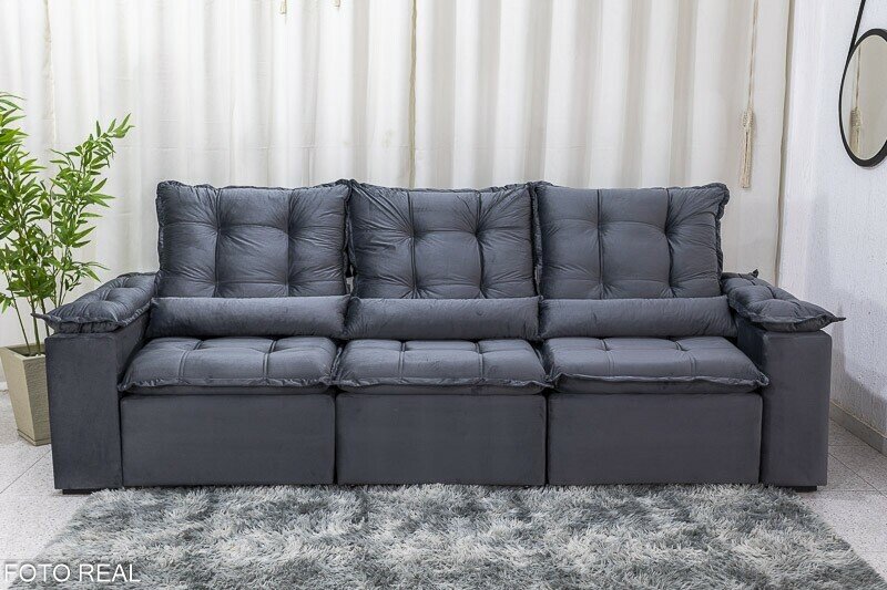 3{%%}Descrição{%%}Sofá Retrátil Reclinável Grécia 2.70m Veludo Cinza – Sem Caixa