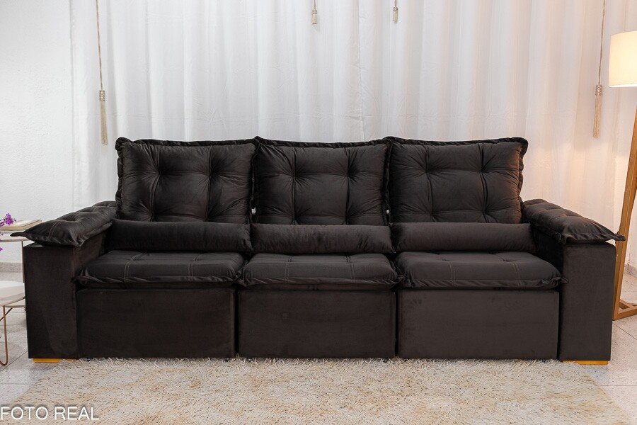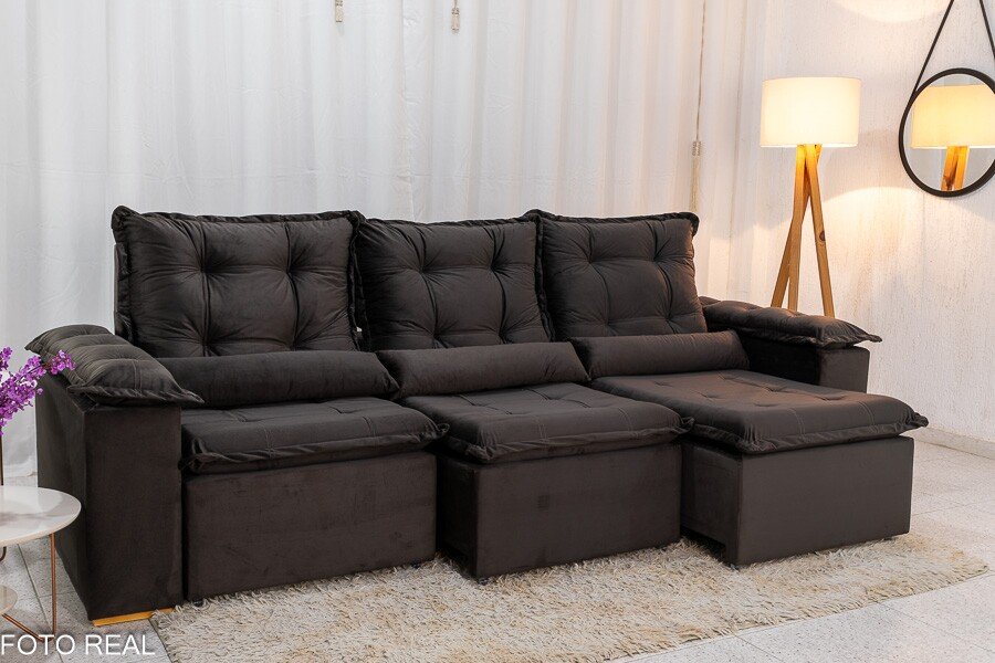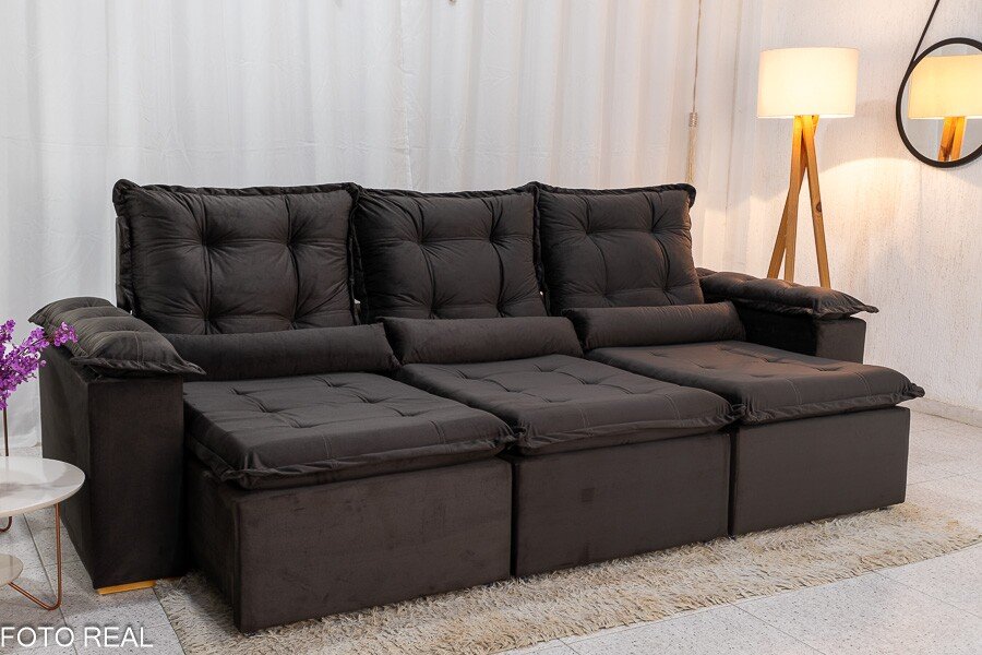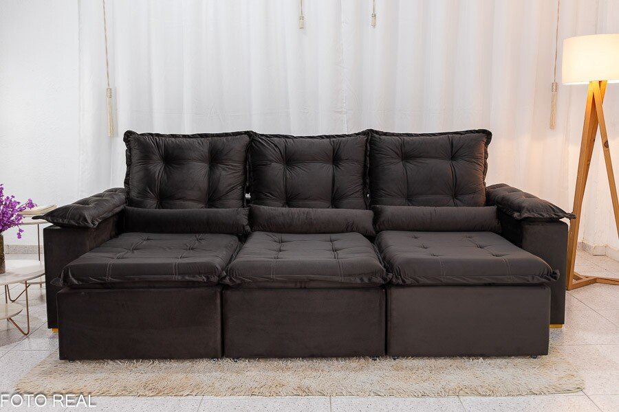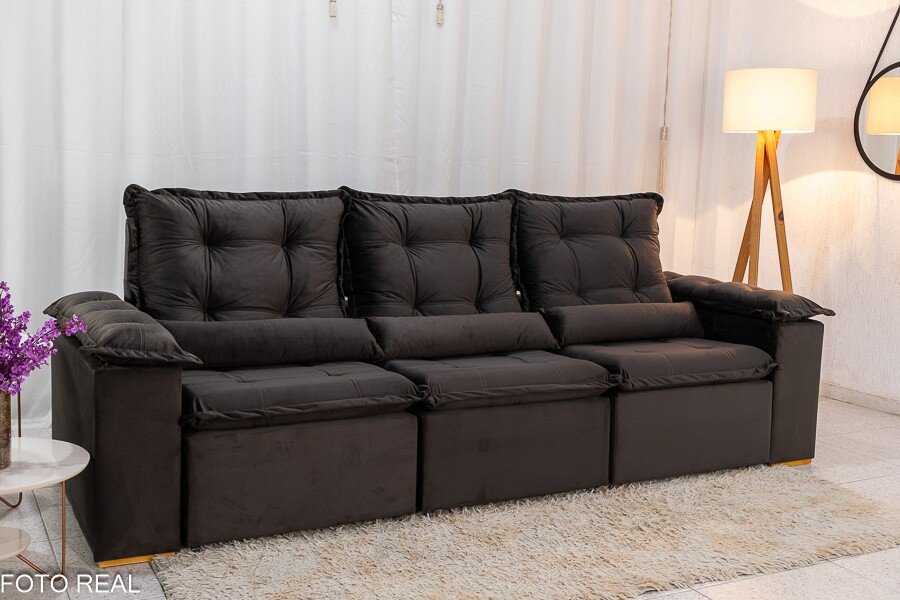 3{%%}Descrição{%%}Sofá Retrátil Reclinável Grécia 2.70m Veludo Marrom – Sem Caixa