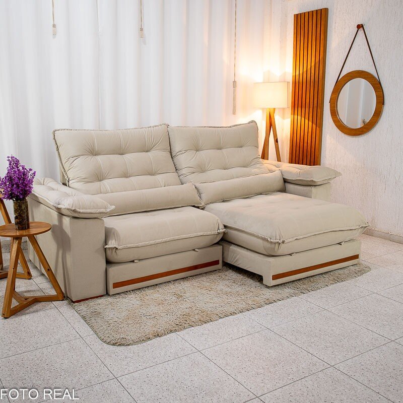 3{%%}Descrição{%%}Sofá Retrátil Reclinável Istambul 2.50m Veludo Bege 406 – Espuma D33
