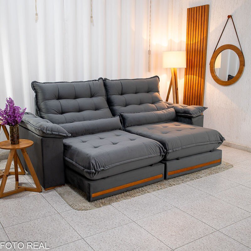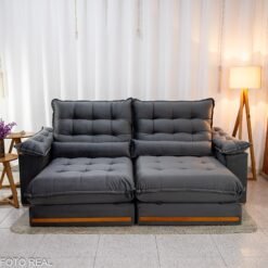 3{%%}Descrição{%%}Sofá Retrátil Reclinável Istambul 2.50m Veludo Cinza 403 – Espuma D33