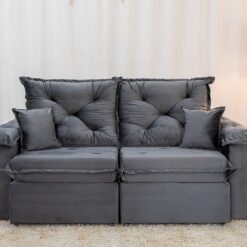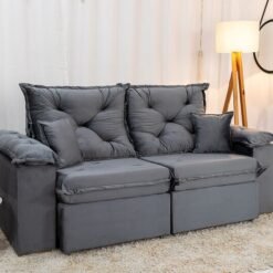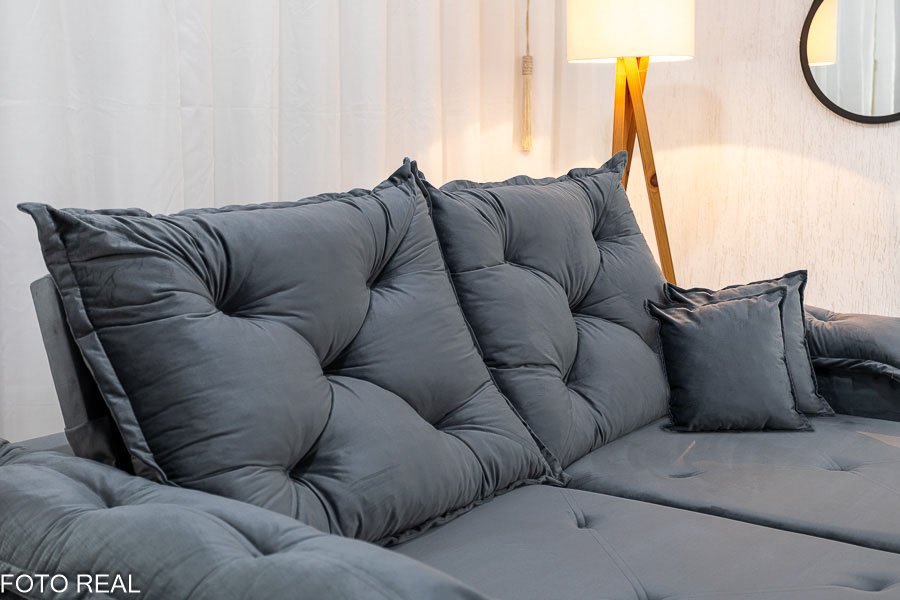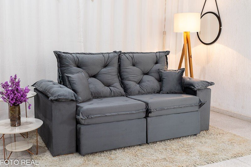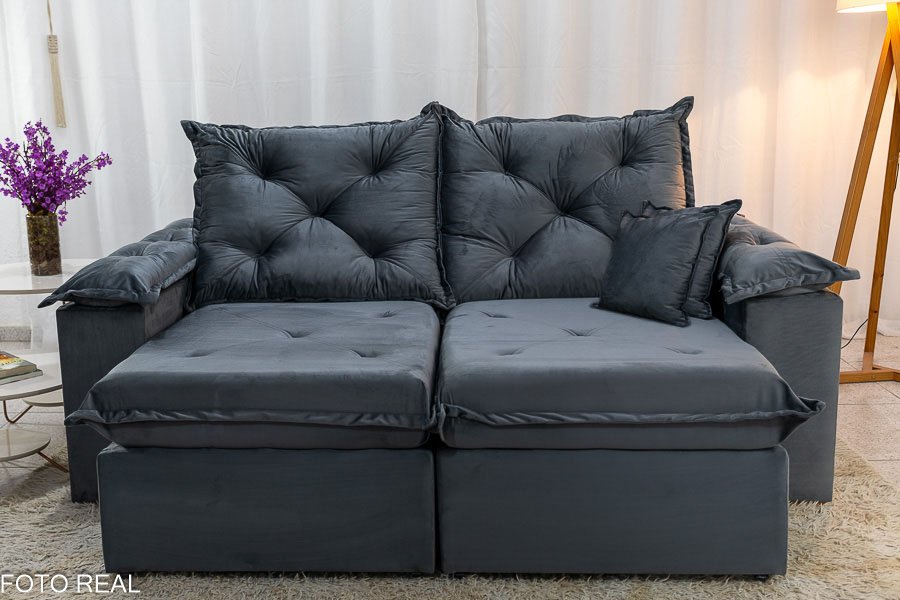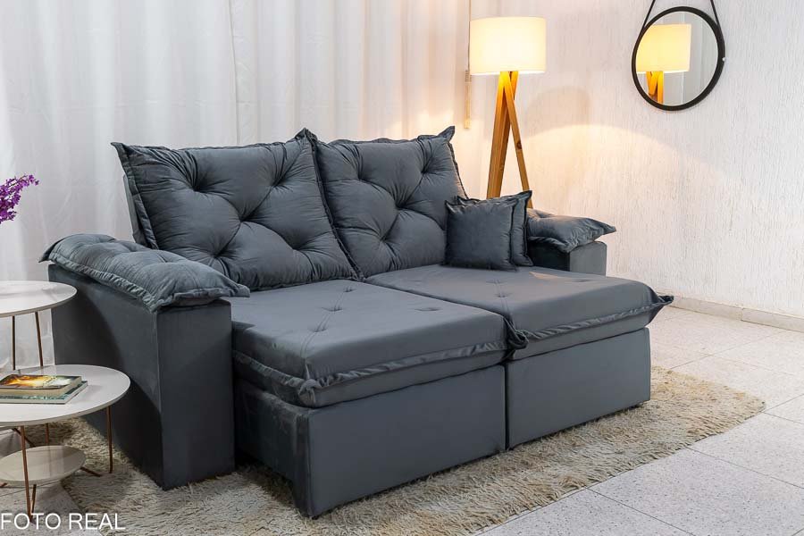 3{%%}Descrição{%%}Sofá Retrátil Reclinável Porto Madri 2.00m Veludo Cinza – D28 Pró Aditivada