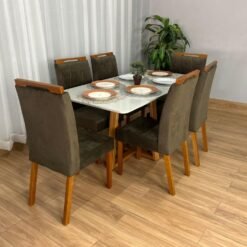 Mesa de Jantar Bali 1.60×0.80 Com 6 Cadeiras Isa – Cinamomo/Off White/Marrom Veludo